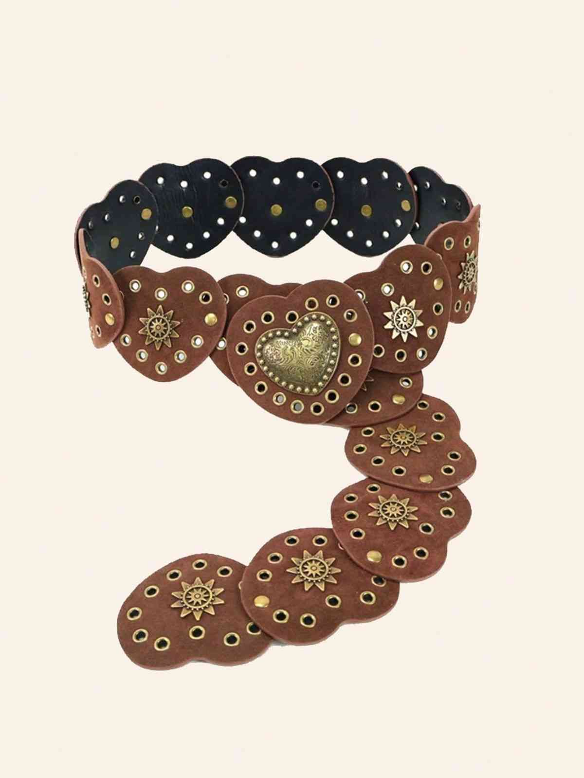 Meet the Kiki Boho Chic Wide Waist Belt —a belt so in-trend, it's practically leading the style parade. Perfect blend of Vintage charm and contemporary glam, this trendy belt features faux leather Heart-Shaped discs wrapping around your waist and a stunning heart-shaped buckle to secure it all at the front. The belt features charm details on the buckle and throughout with intricate carvings and metal designs making this fashion belt a must have this season. The Kiki Waist Belt offers a snug, flattering fit while keeping you at the top of your fashion game.